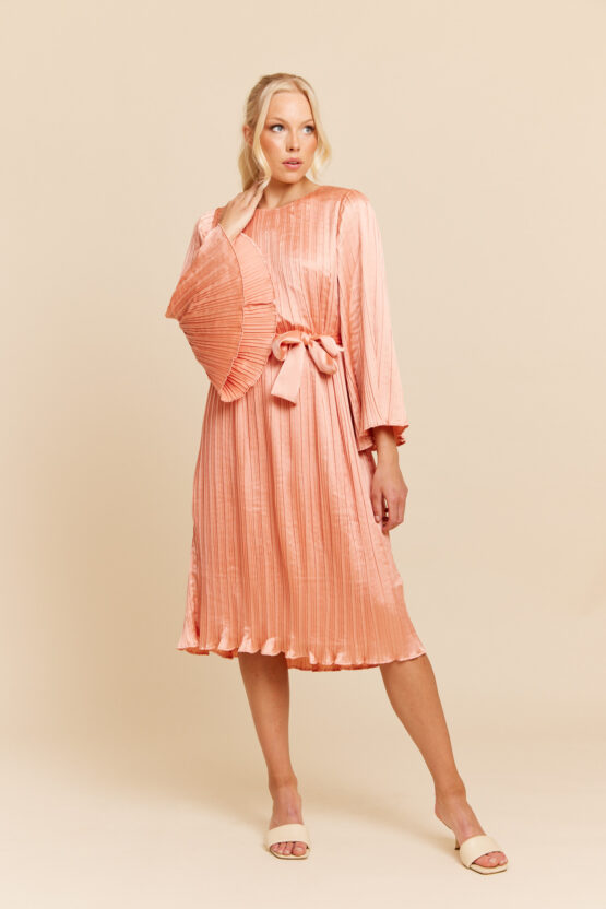 The Femina Dress is a graceful and stylish piece in a soft, peachy hue. Made from a delicately pleated fabric, this dress features wide, dramatic sleeves with pleated detailing that adds a unique flair. The waist is cinched with a matching tie belt, creating a flattering silhouette. Falling to a midi length with a subtle ruffle at the hem, this dress is perfect for both daytime events and evening occasions.