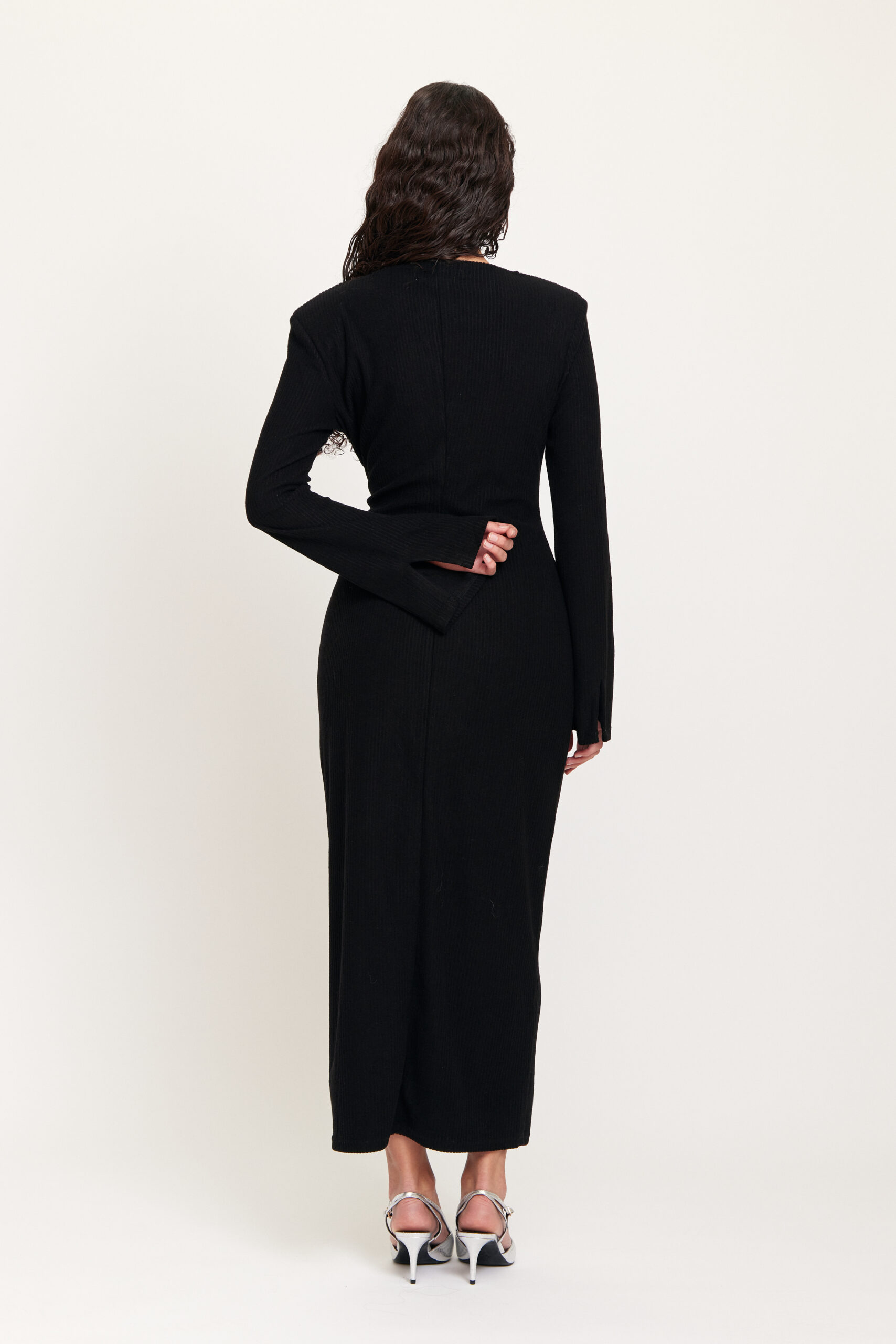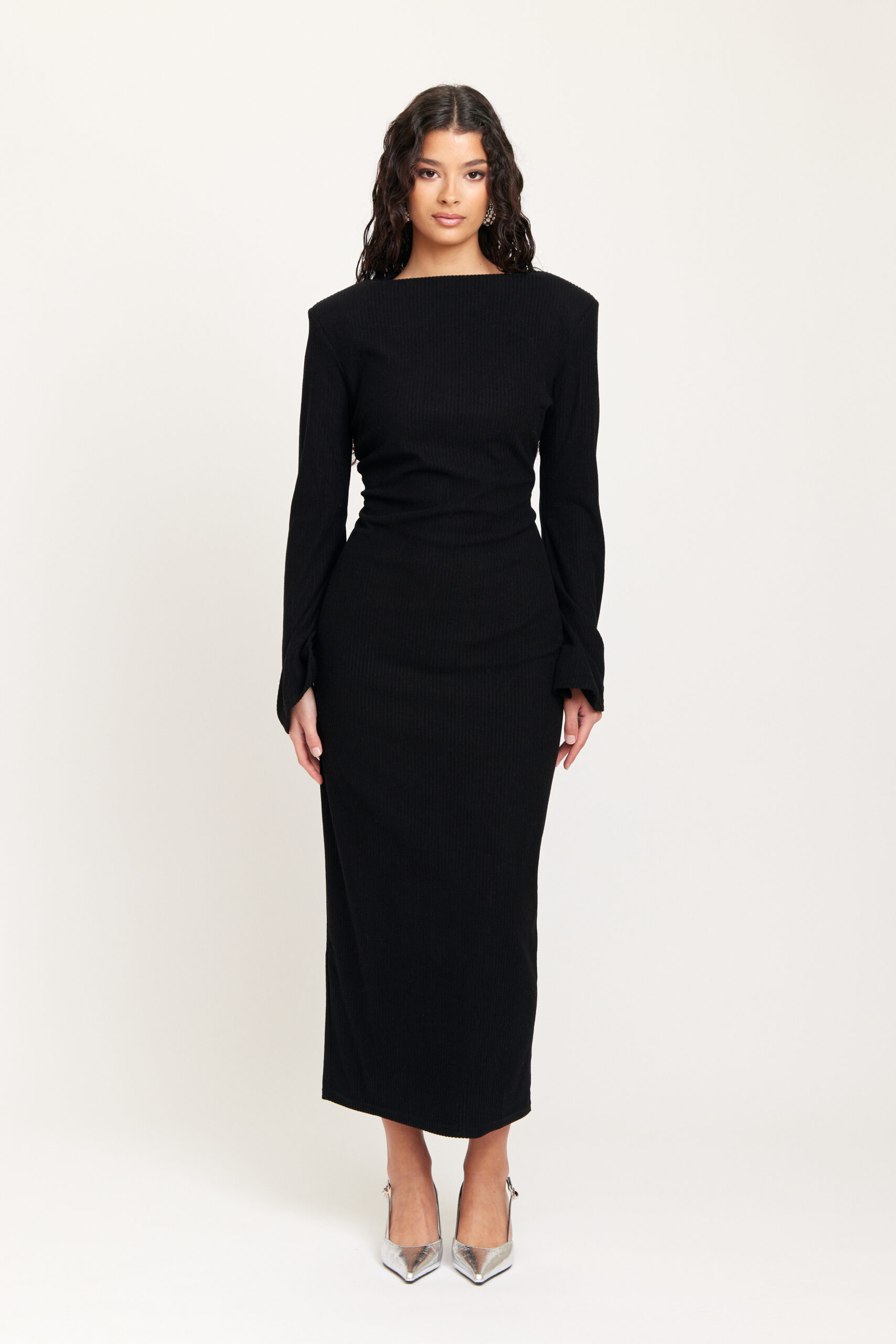 Detta är en elegant klänning i mjukt, stretchigt och bekvämt material med en sammetskänsla. Klänningen har axelvaddar som markerar axelbanden och långa ärmar. Den här klänningen kommer att få dig att både se fantastisk ut och känna dig fantastisk. Modellen är 175 cm lång och bär storlek S.