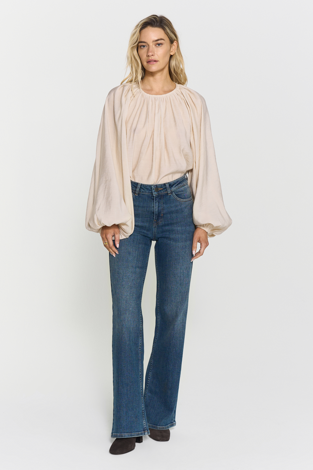 Giane-blusen är ett raffinerat plagg designat för att ge en touch av elegans till din vardagsgarderob. Med sina voluminösa ärmar och mjuka rynkor i halsringningen skapar den en graciös silhuett som smickrar figuren. Det lätta tyget faller vackert, vilket gör den lika lämplig för alla tillfällen.